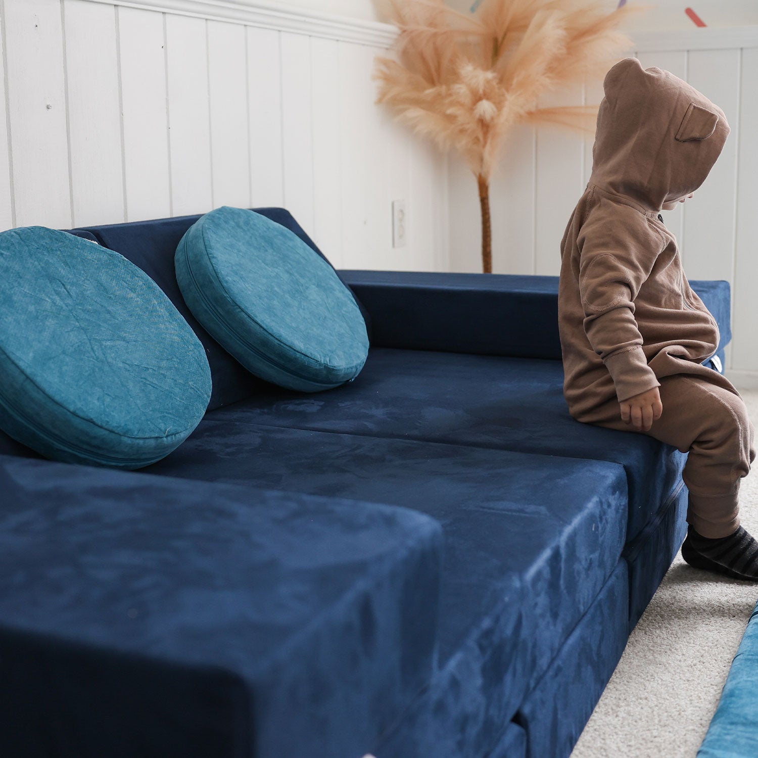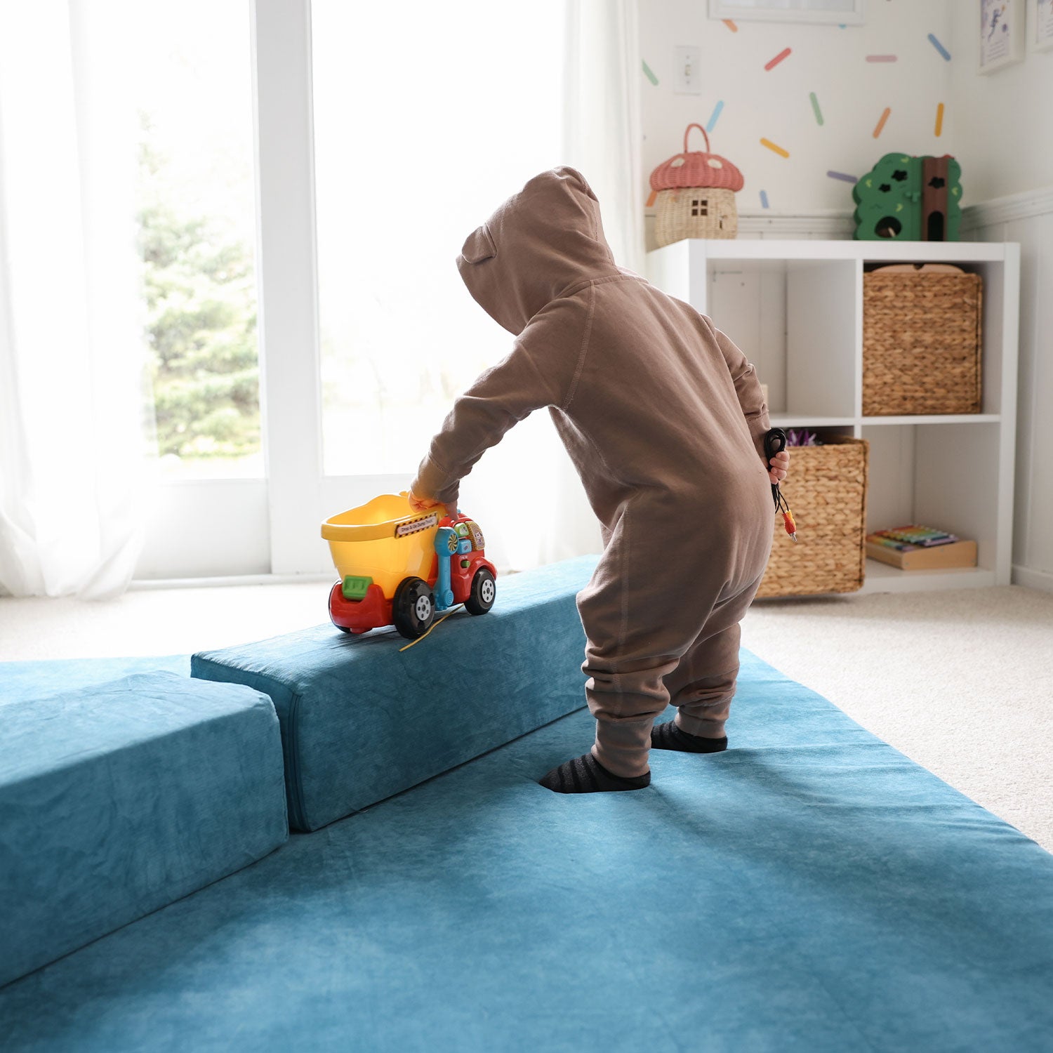 Child playing with cushion pieces from a modular foam play couch for kids—high-density, safe, and soft Canadian floor couch ideal for creative play.